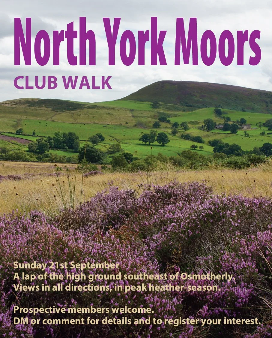 Monthly weekend walk; this time North York Moors near Osmotherly, 8-10 miles approx. Sunday 21st September.